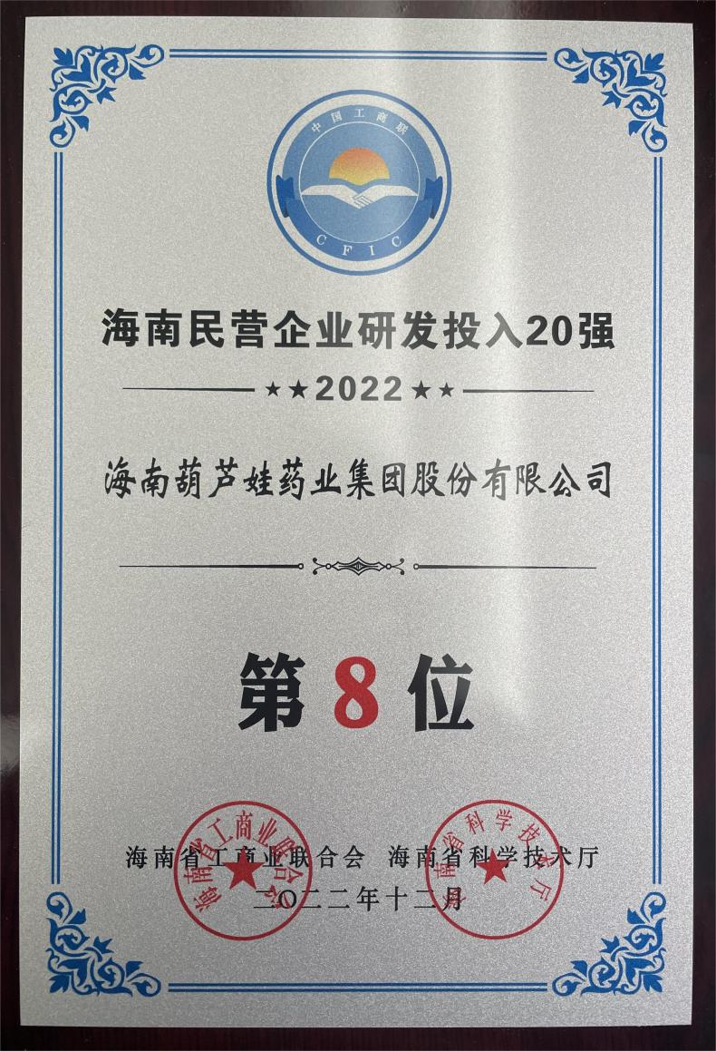 12月23日,2022海南民营企业50强和研发投入20强发布会在海口举行。会上发布了“2022海南民营企业50强”“2022海南民营企业研发投入20强”榜单和分析报告。PA官方网站药业再次荣登两榜,在海南民营企业50强榜单中位列第25位,较去年上升8位,这也是公司连续三年登榜;在海南民营企业研发投入20强中位列第8位,较去年上升7位。