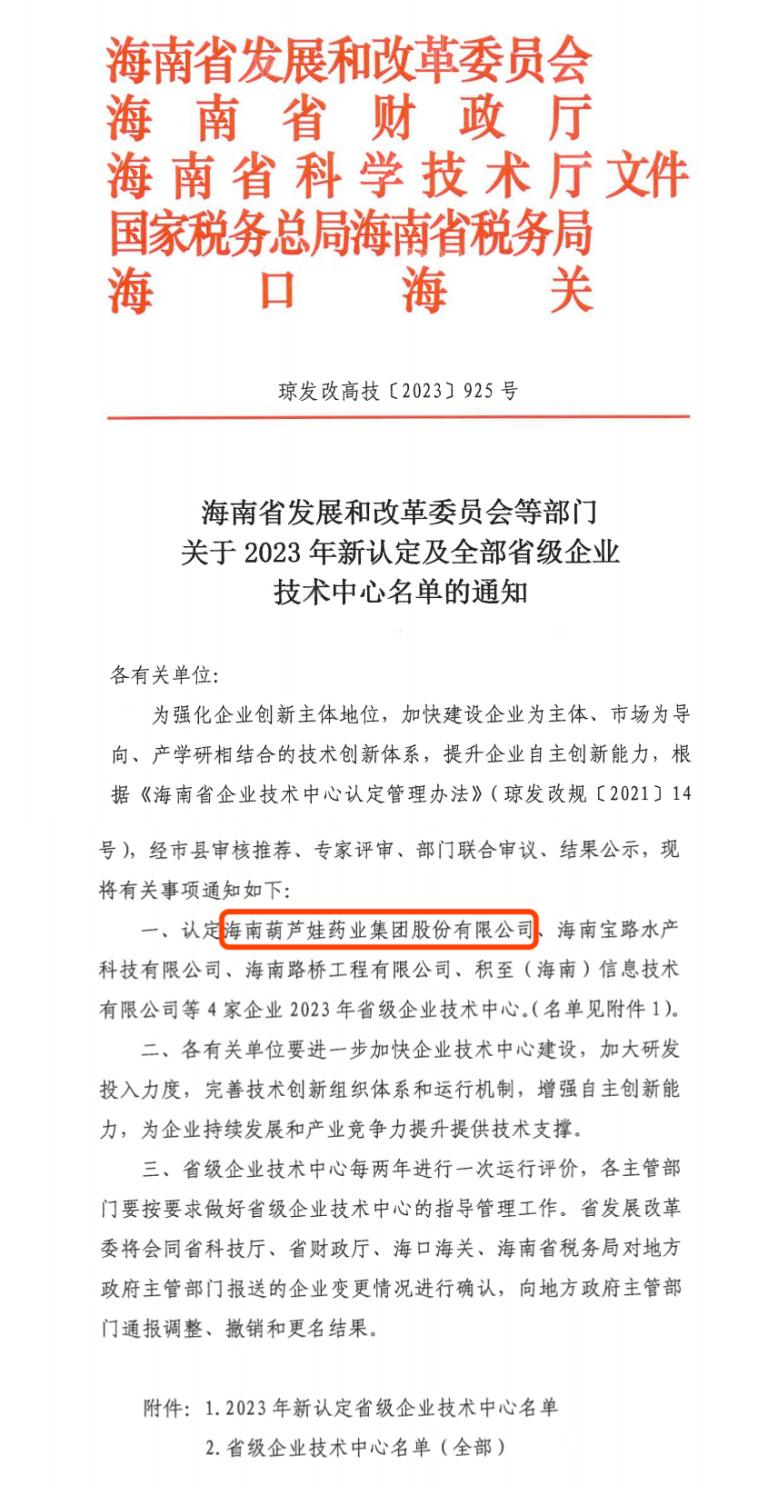 近日,海南省发改委等多部门联合公布了《关于2023年新认定及全部省级企业技术中心名单的通知》,其中,海南PA官方网站药业集团股份有限公司成功通过评审,被认定为省级企业技术中心,是本次获批的4家企业之一。
